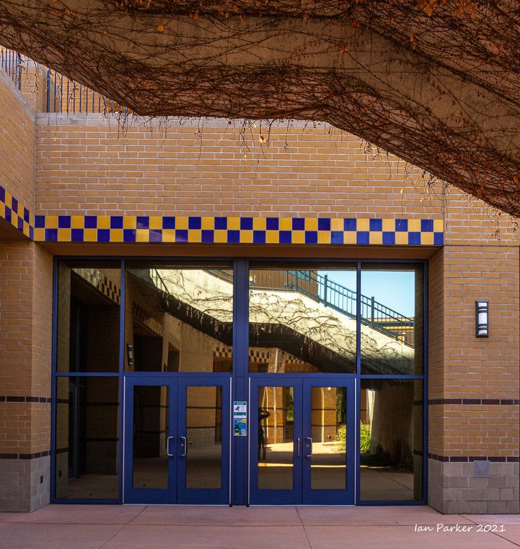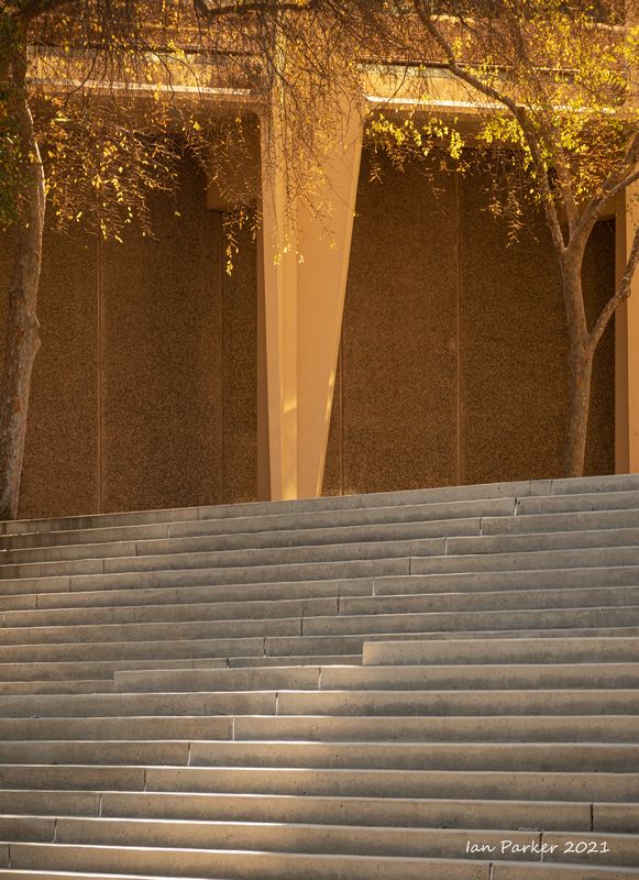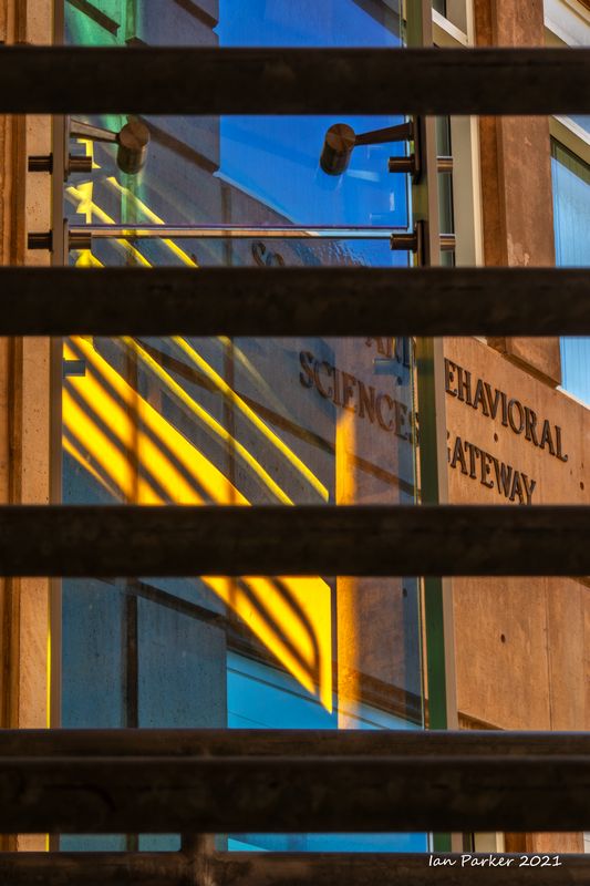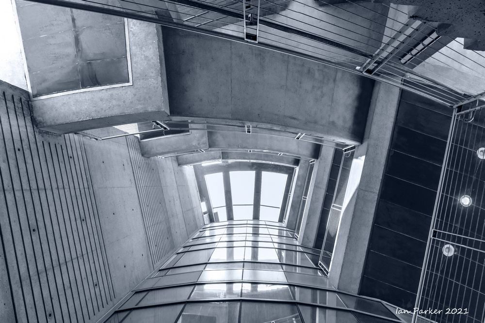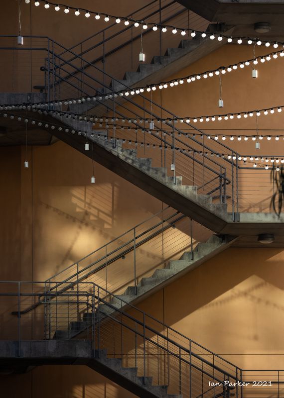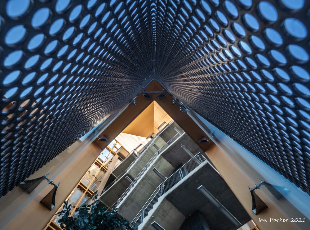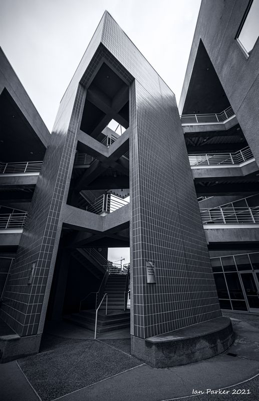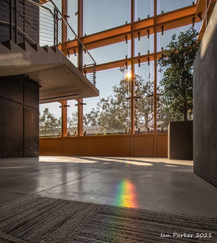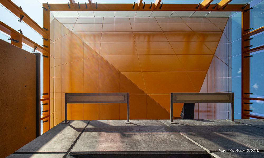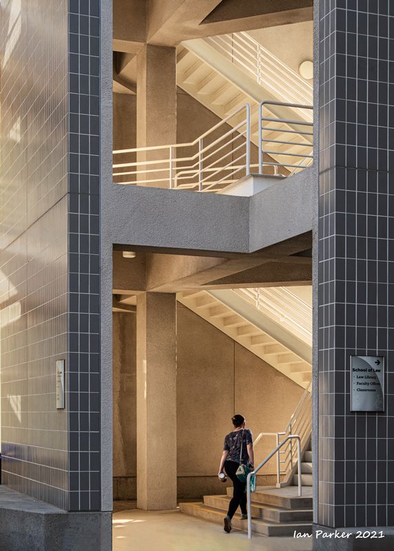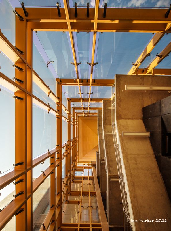 The academic buildings had been locked throughout the covid pandemic with key-card access only for those researchers working in a building. Last week arrangements started to return to normal, with buildings unlocked during the day. One building I had particularly hankered to get into was the Engineering Hall, with its glass-enclosed stairway supported by a spectacularly orange framework and topped by an orange inverted Vee structure.
