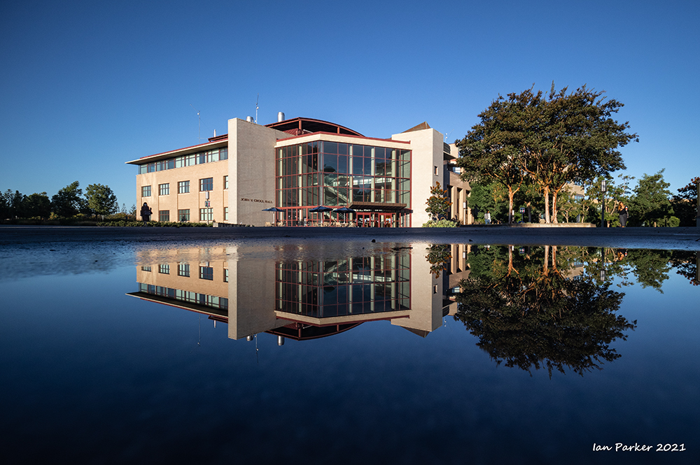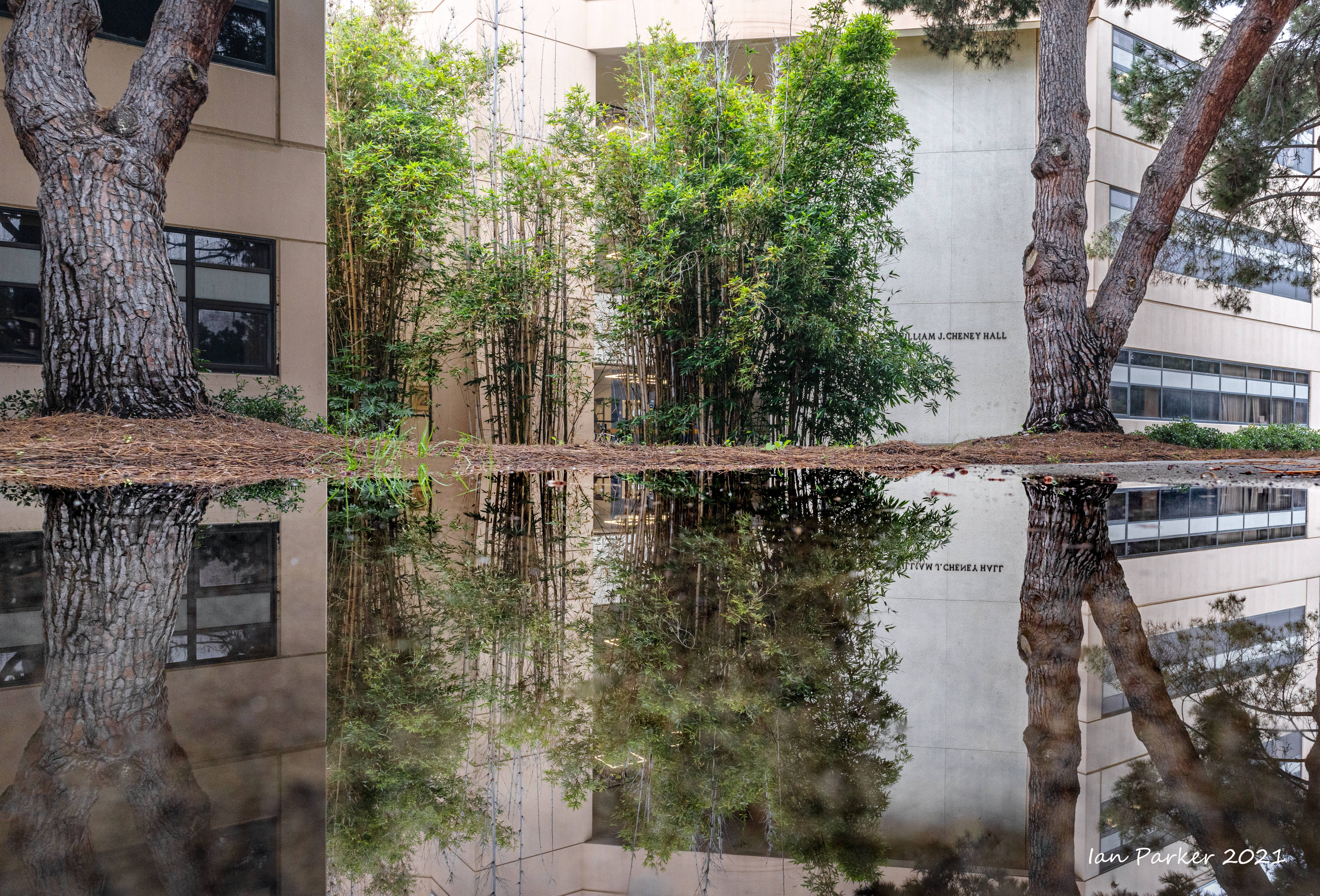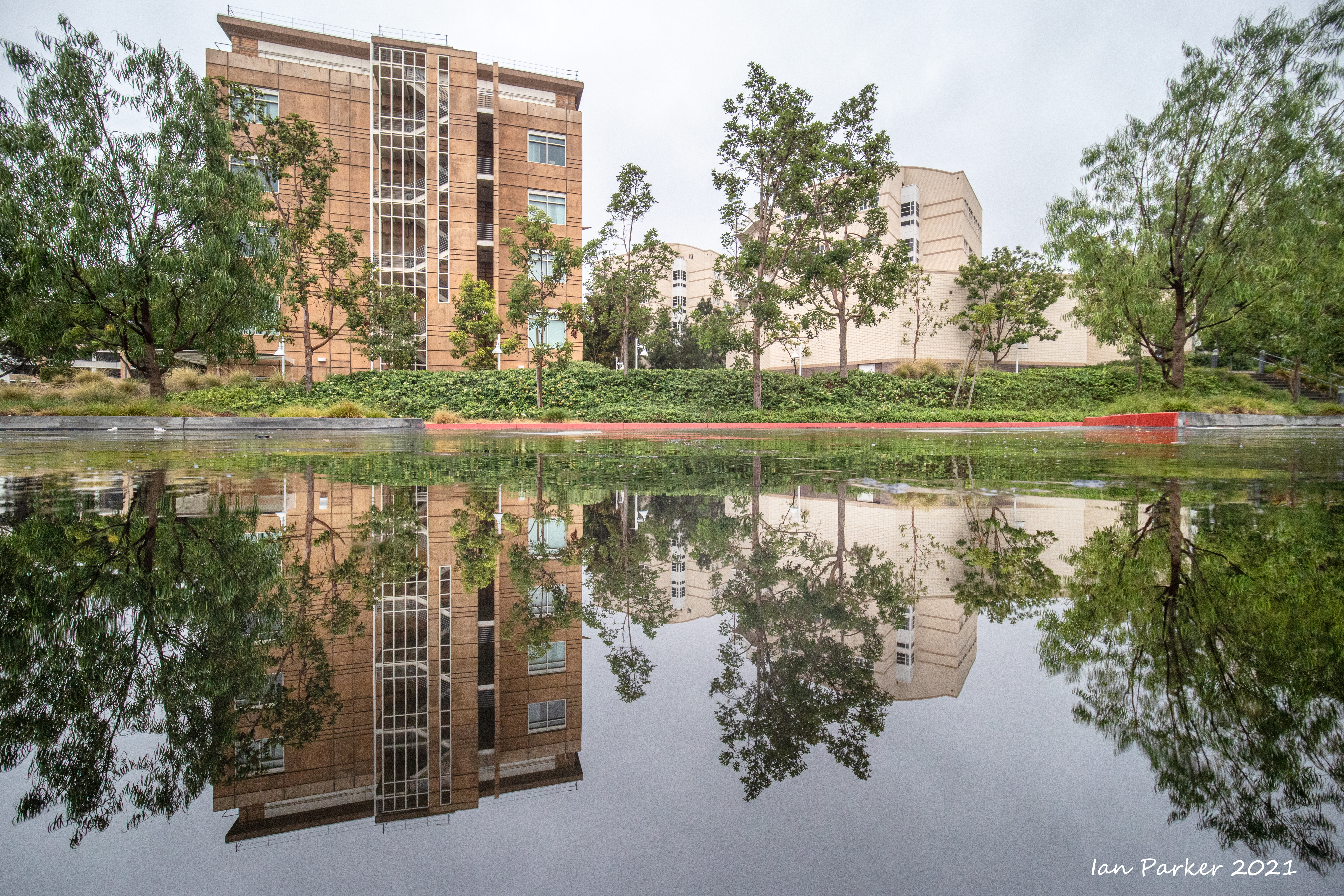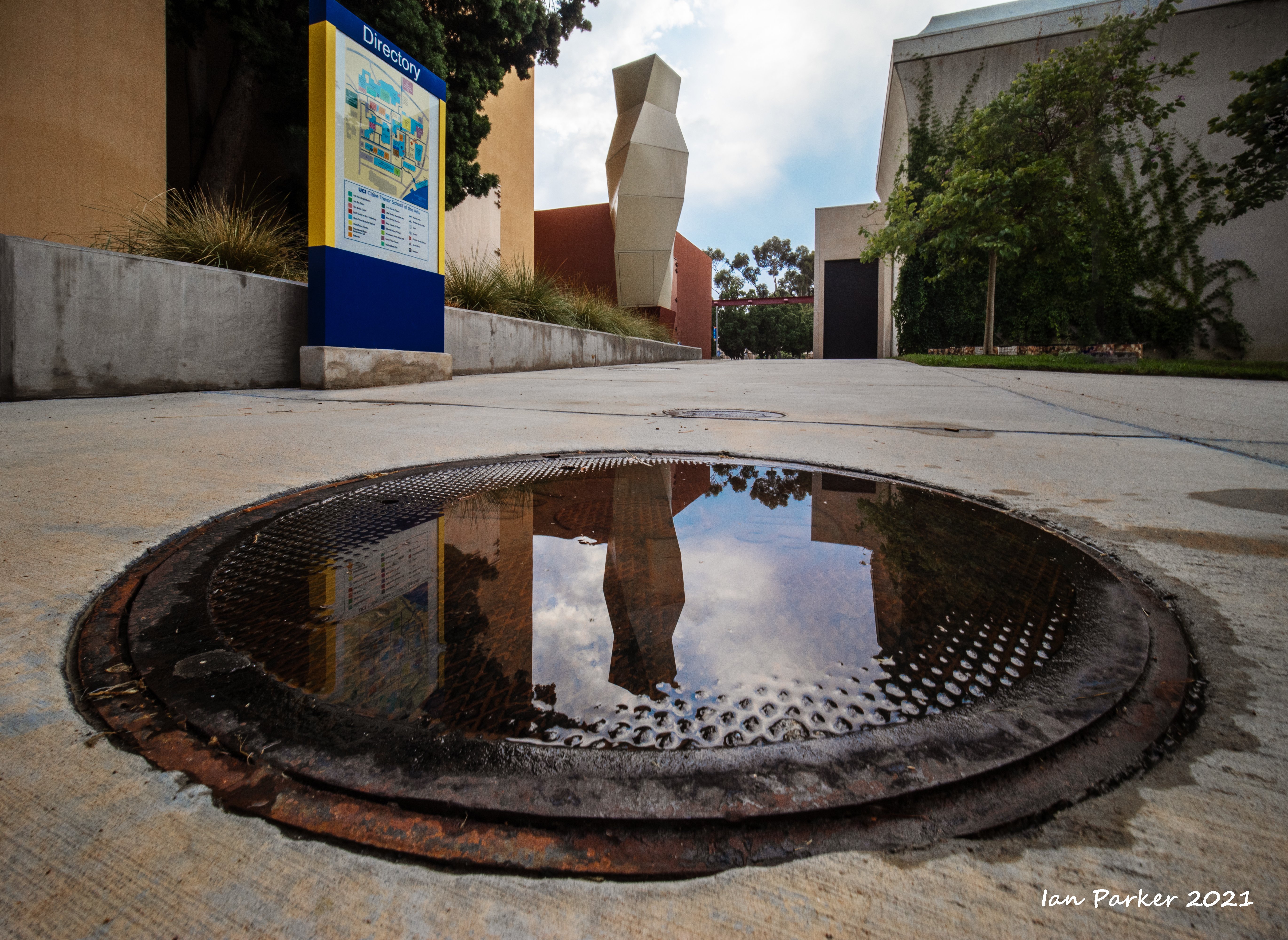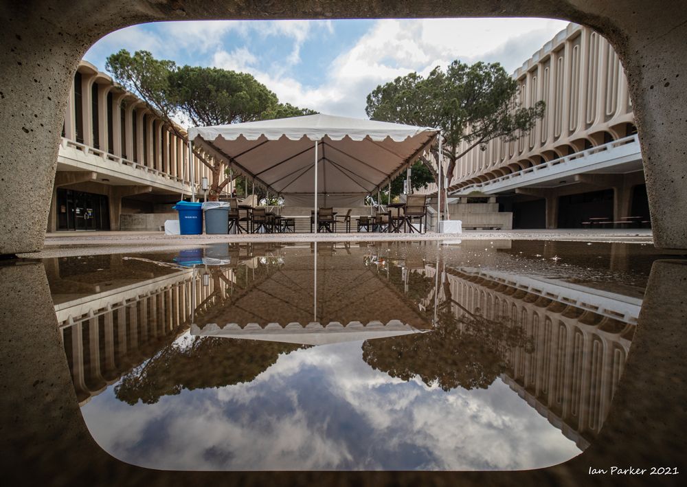 An unusually ferocious thunderstorm on Monday night took out power to the campus for several hours; but the downpour left nice reflecting pools when the sky cleared the next morning.