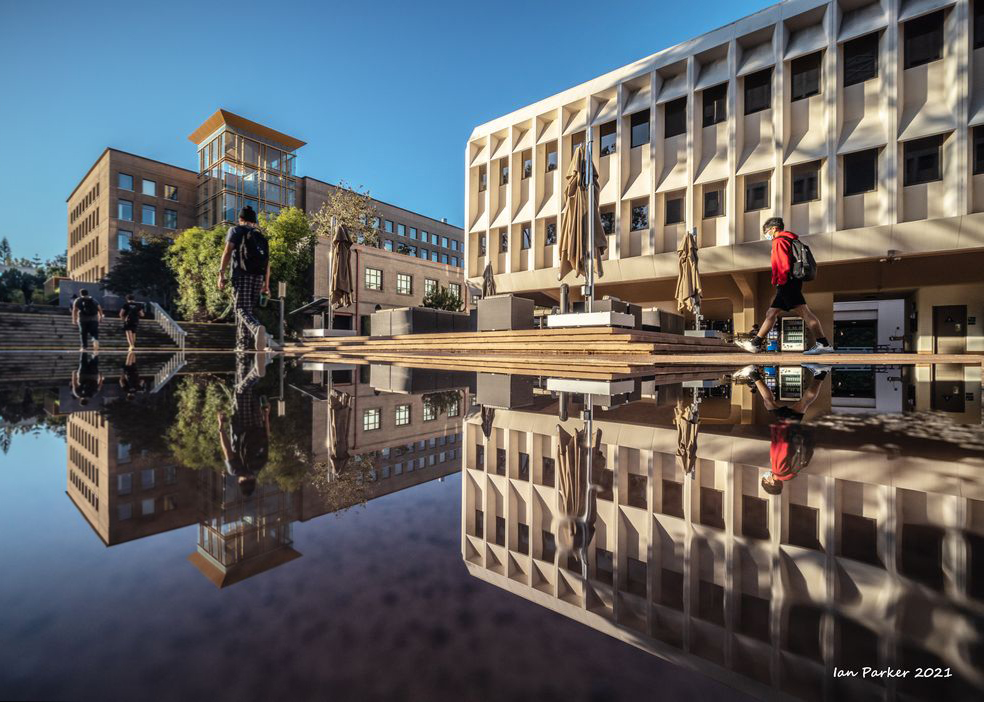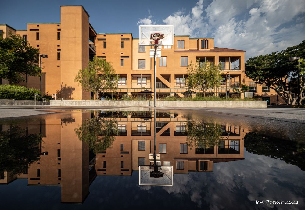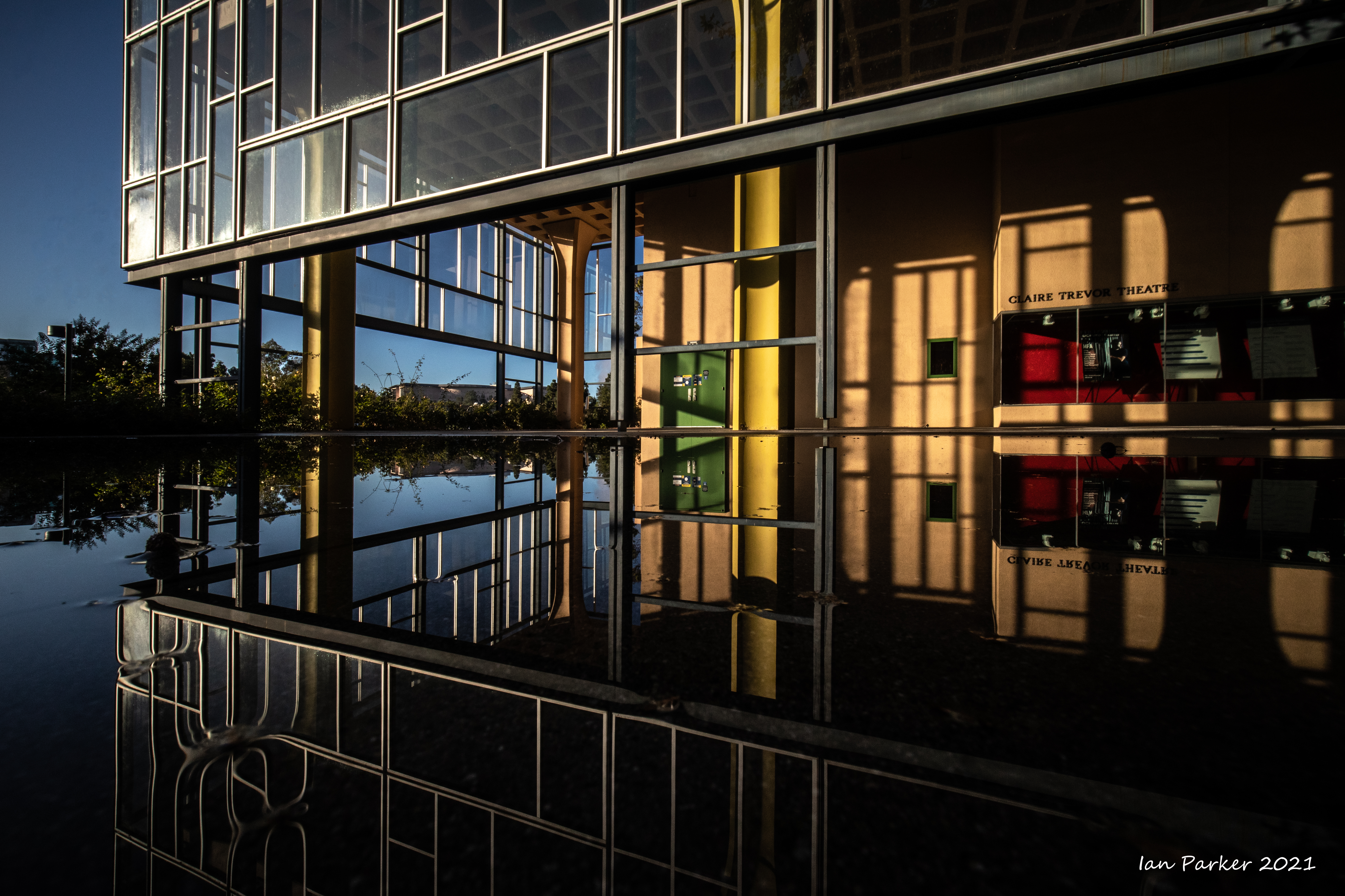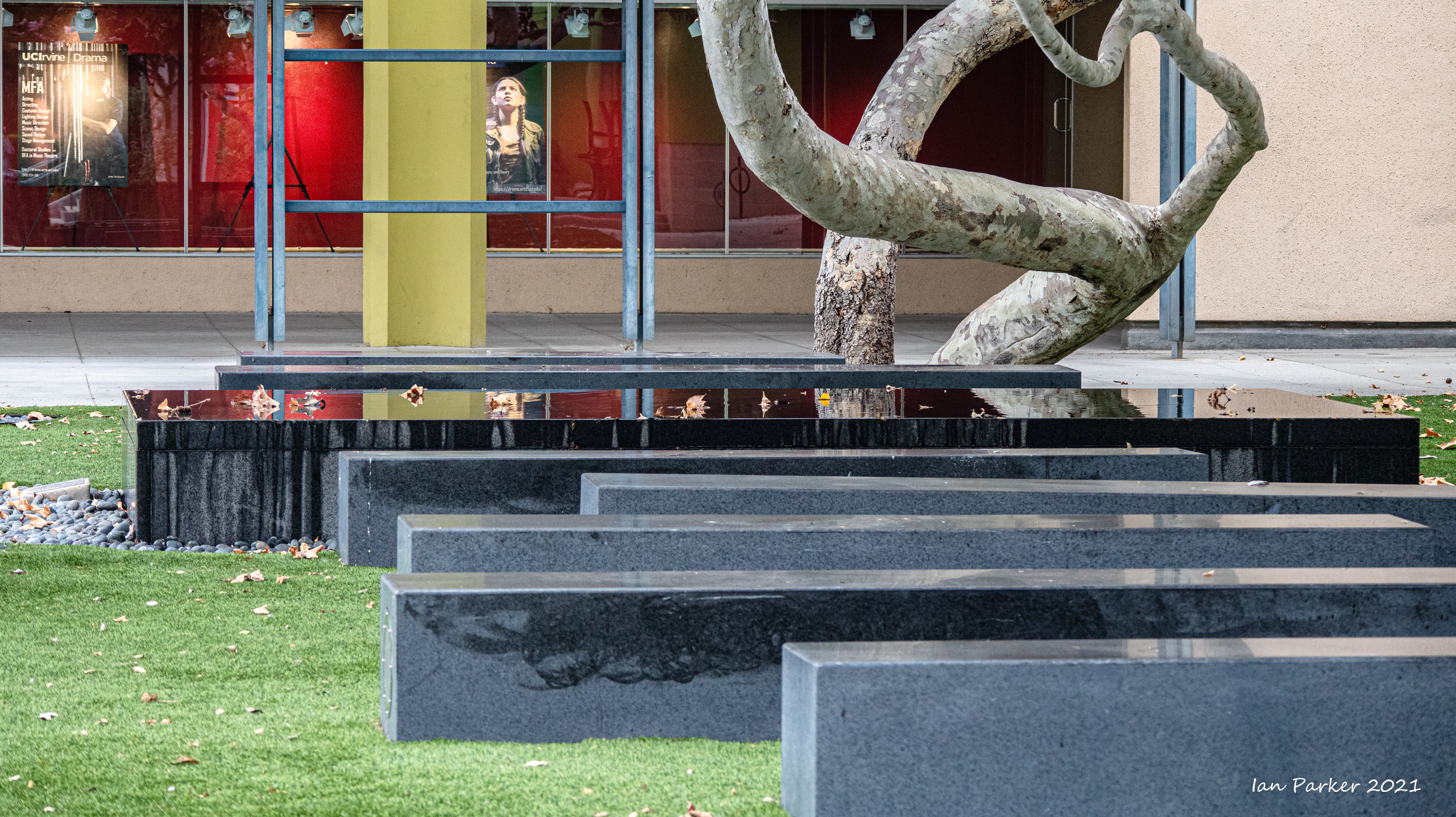 An unusually ferocious thunderstorm on Monday night took out power to the campus for several hours; but the downpour left nice reflecting pools when the sky cleared the next morning.
